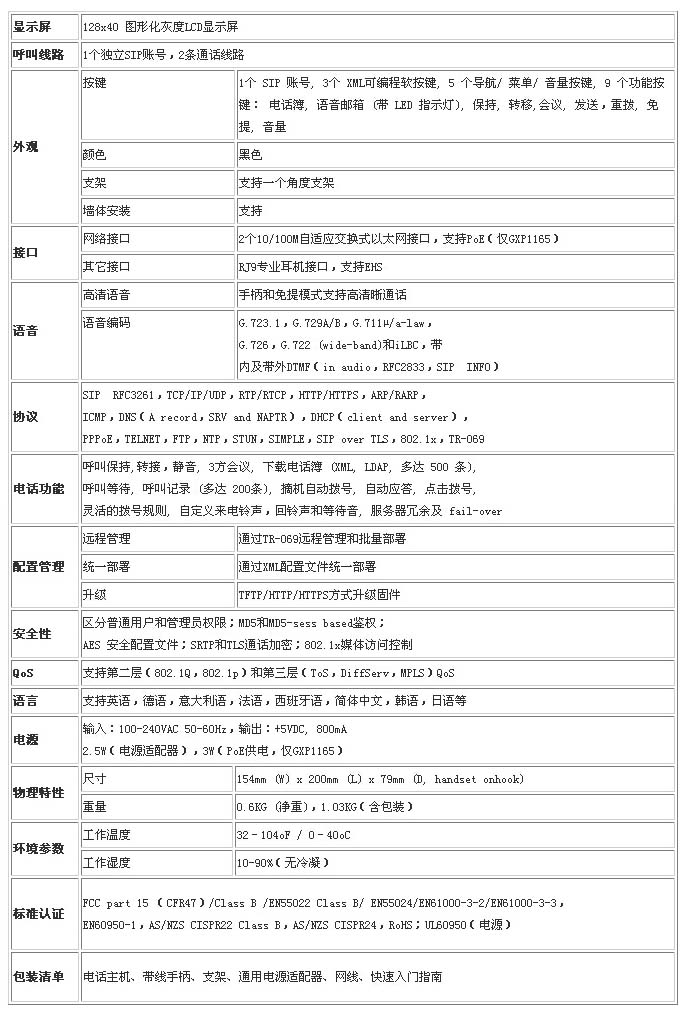 GXP1160/1165 是一款单账号,可同时进行 2 路通话的下一代中小企业型IP电话。128x40 图形化灰度LCD显示屏,3个XML可编程软按键,双网口,支持PoE功能(仅GXP1165),3方会议,RJ9耳机接口,支持EHS。GXP1160/1165具有卓越的高清语音质量,领先丰富的电话功能,可定制的个性化信息和应用程序服务,支持自动部署和先进的安全保护机制,广泛兼容第三方SIP 设备和领先的SIP/NGN/IMS平台。对于正在寻找高性价比IP电话的中小型企业来说,GXP1160/1165是您的理想选择。