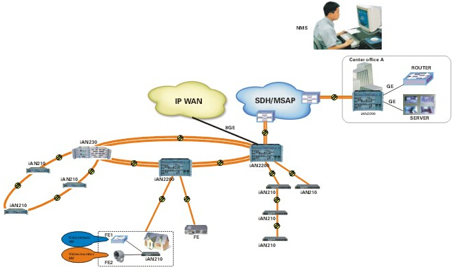 iAN220智能接入平台MSAP是STM-1级别的多业务SDH(Synchronous Digital Hierarchy)光传输系统。具有两路STM-1等级群路光口,实现E1和基于GFP封装的以太网等业务的复用和传输。设备支持全时隙交叉功能,上下电路方便灵活,可作为上下电路复用器或终端复用器,组建点对点、链网、环网网络。